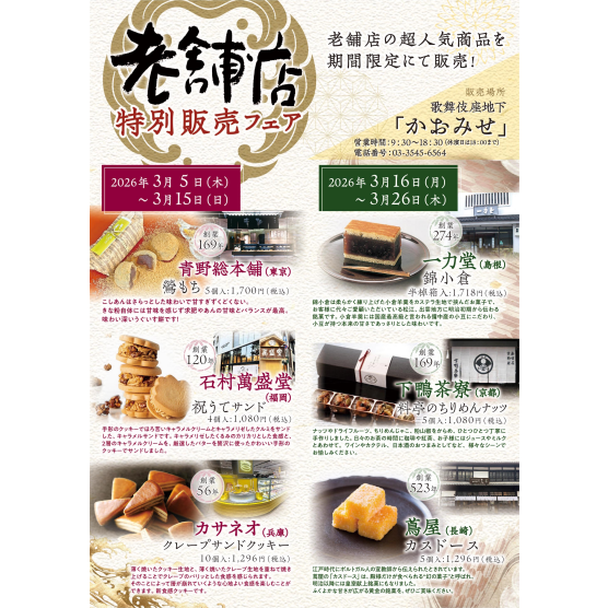 - 3月限定!老舗店特別販売フェアのお知らせ~地下2階「お土産処かおみせ」