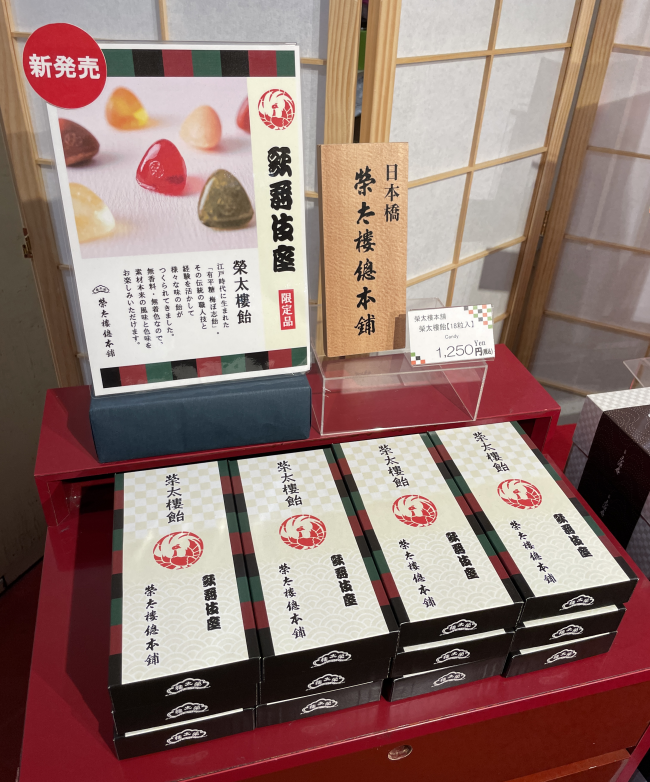 新商品!歌舞伎座限定・榮太樓總本鋪「榮太樓飴」のご紹介 更新日:2025.10.08 1階「お土産処 木挽町」では、榮太樓總本鋪の代表銘菓【梅ぼ志飴】を歌舞伎座限定パッケージで新発売! 江戸時代に生まれた「有平糖 梅ぼ志飴」。 無香料・無着色なので、素材本来の風味と色味をお楽しみいただけます。 価格は1,250円(税込)。歌舞伎座限定パッケージで、観劇のお土産に好適です!
