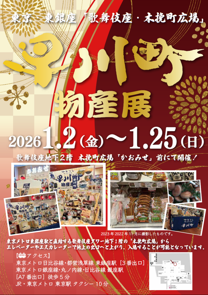 1月早川町物産展を開催~歌舞伎座地下2階 木挽町広場 更新日:2025.12.28 1月2日(金)~25日(日)、毎年恒例となりました“日本一人口の少ない町”と知られている山梨県・早川町の物産展が、歌舞伎座地下2階「木挽町広場」で開催されます。 新鮮な山の幸や、ベーコン・フランクフルトなどのお肉類、白鳳みそなどの特産品も! 1月には歌舞伎座LINEでのプレゼントも企画中。見て選んで味わって、楽しさいっぱいです。ぜひご来店ください! 2024年早川町物産展の様子
