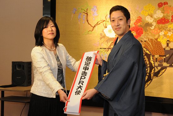 2月23日(月)、歌舞伎座3階お食事処「花篭」で、二月大歌舞伎に出演中の中村梅枝さんが、「確定申告PR大使」に任命され、国税庁ホームページ「確定申告書作成コーナー」の利便性と確定申告書の早期提出のPRを行いました。