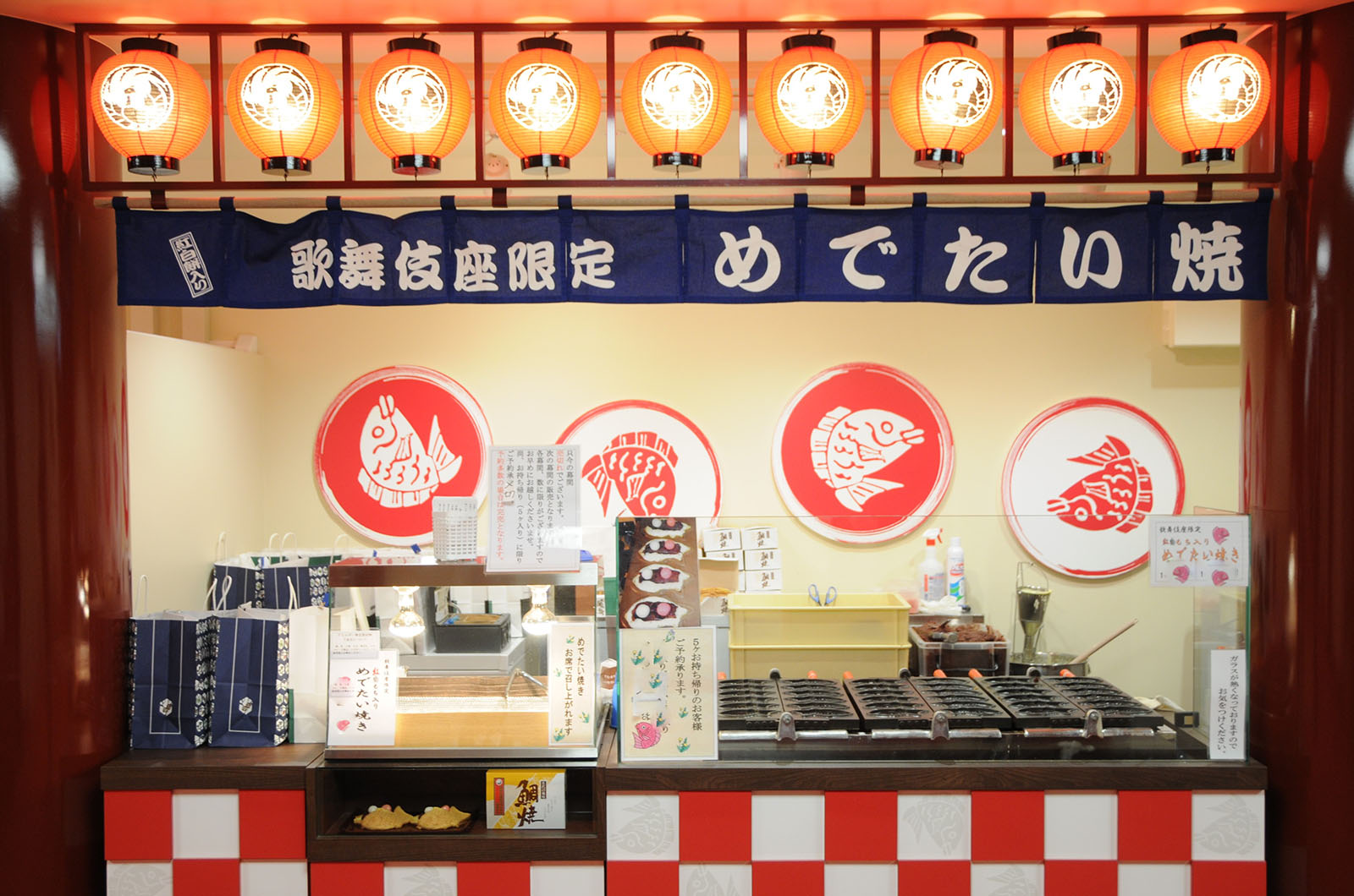 和装小物「さくら桟敷」、印伝小物「JIZAING」、姫かのこ「銀座鹿乃子」、 錦玉羹の「菓匠翁」が軒を連ねます。その他、人形焼、俳優グッズ、各種ド リンクもご用意しております。歌舞伎座名物「めでたい焼」もこち らです。のれん街はご観劇のお客様のみご利用が可能です。