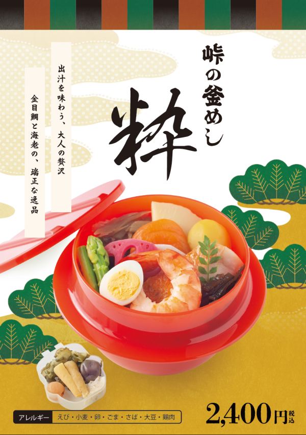 「峠の釜めし-粋-赤釜仕様」のご紹介~地下2階お弁当処「やぐら」 更新日:2026.04.02 4月2日(木)より、地下2階お弁当処「やぐら」では、「峠の釜めし-粋-赤釜仕様」を販売します! 香ばしく焼き上げた金目鯛と、艶やかな海老のうま煮。 紅白の蓮根や彩り野菜を添え晴れやかな一釜に仕立てました。 伝統の味わいに、華やぎと粋を添えた特別仕様の峠の釜めしを、ぜひどうぞ!