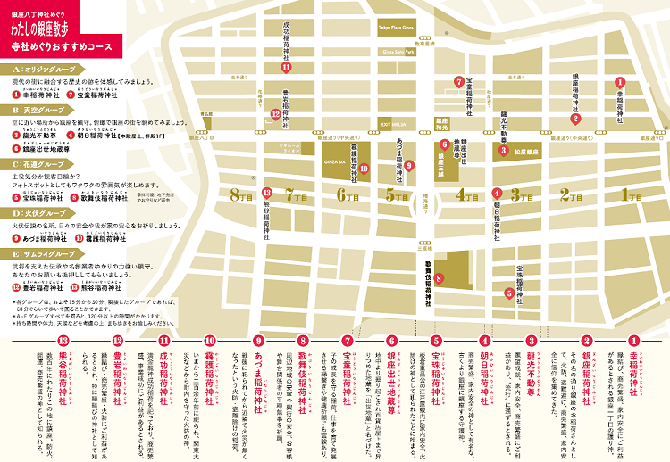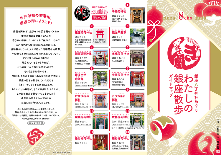 また銀座八丁神社めぐりとあわせ通年使える「わたしの銀座散歩」ガイドマップを作成しており、銀座にある稲荷神社、不動尊、地蔵尊の寺社をグループごとにめぐるおすすめコースもご紹介しております。