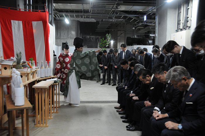 劇場や建物関係者が列席する中、鐡砲洲稲荷神社の宮司による祝詞が奏上され、関係各社の代表者による玉串奉奠(たまぐしほうてん)が行われました。