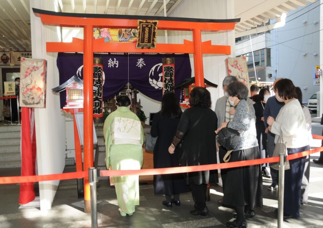 「初午祭」が執り行われました 更新日:2026.02.01 2月1日(日)、歌舞伎稲荷神社で「初午祭」が執り行われ、ご観劇のお客様が参拝されました。 京都の伏見稲荷大社に、ご祭神が舞い降りた日とされる旧暦2月11日が“初午(はつうま)”だったため、2月最初の午の日に、全国の稲荷神社で五穀豊穣、商売繁盛などを祈願する祭礼が行われます。 古くからの言い伝えで“最も運気が高まる日”ともいわれています。 開場前のご祈願 歌舞伎座では、毎年二月“初午”もしくは“二の午”で、一年の無事を祈願したお祓いを行っています。 ご観劇のお客さまも、幕間に参拝。 お汁粉とお神酒が振る舞われ、思いがけない祭事を楽しまれていました。 古来から伝わる神事も、歌舞伎座では大切に守り続けています。 ご参拝のお客様に、お神酒とお汁粉を振舞いました 今年の歌舞伎稲荷神社の大地口は『積恋雪関扉』(左)お土産処かおみせでは“初午祭”の御朱印をご用意(右)