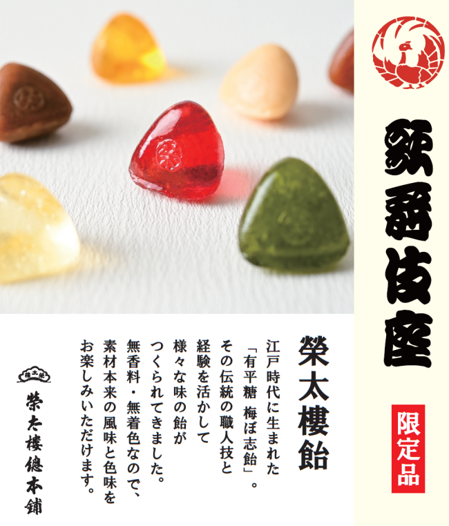 新商品!歌舞伎座限定・榮太樓總本鋪「榮太樓飴」のご紹介 更新日:2025.10.08 1階「お土産処 木挽町」では、榮太樓總本鋪の代表銘菓【梅ぼ志飴】を歌舞伎座限定パッケージで新発売! 江戸時代に生まれた「有平糖 梅ぼ志飴」。 無香料・無着色なので、素材本来の風味と色味をお楽しみいただけます。 価格は1,250円(税込)。歌舞伎座限定パッケージで、観劇のお土産に好適です!