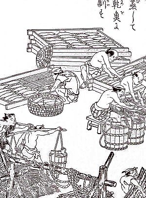 | 当時の鰹節は、生(なま)切りした鰹を煮て燻乾した現在の荒節(あらぶし)に相当するものでしたが、その後荒節の表面を削って形を整えた裸節(はだかぶし)が作られ、さらに享保(1716-36)のころから、かび付け法が行なわれて、現在の鰹節に近い製品が作られるようになりました。 |