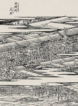 木挽町に初めて出来た芝居小屋は山村座で、正保元年(1644)のことでした。その後慶安元年(1648)には河原崎座が建ち、万治3年(1660)には森田座が出来ました。そのころの木挽町は芝居町として繁栄していましたが、山村座の取りつぶしや、河原崎座の廃座などがあり、天保13年(1842)の水野越前守の庶政改革で、中村座・市村座とともに森田座も浅草の猿若町に移りました。